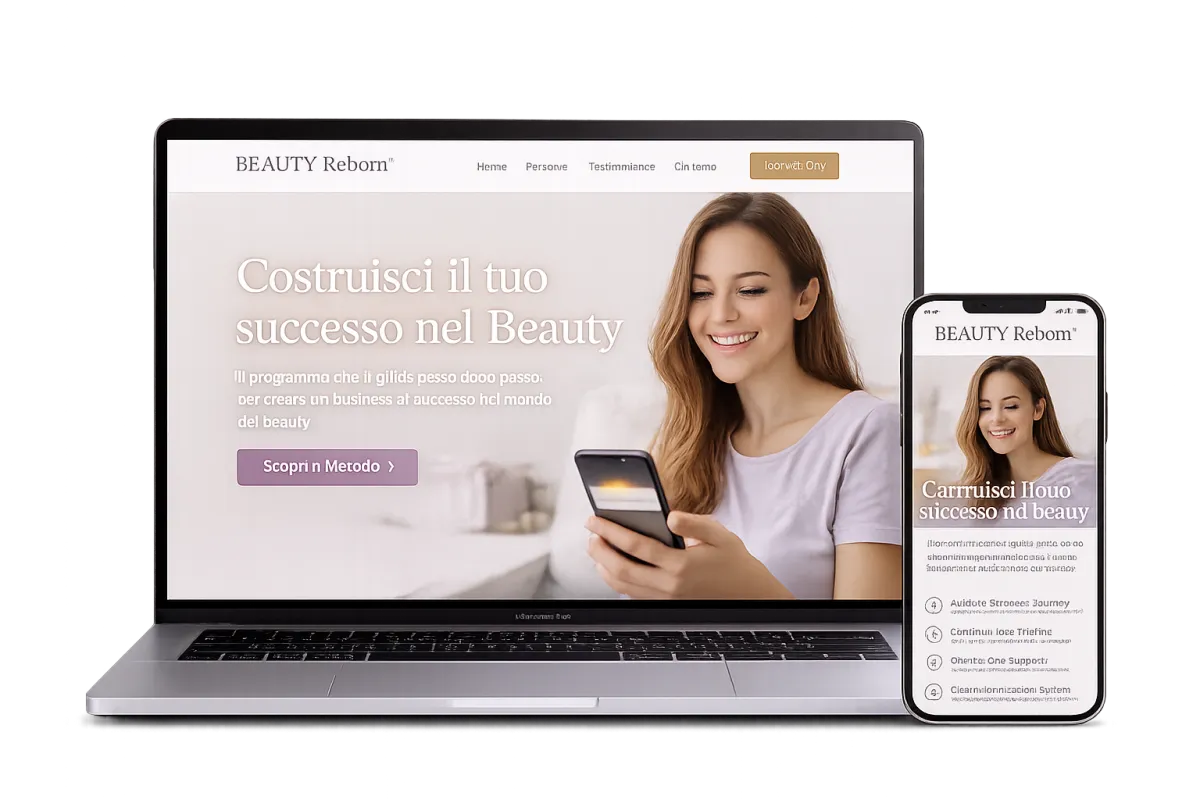 Scopri come il Metodo BEAUTY Reborn™ ti guida passo dopo passo a costruire la tua attività online nel settore beauty, attraverso un sistema chiaro, supporto live e una piattaforma professionale già pronta per monetizzare.